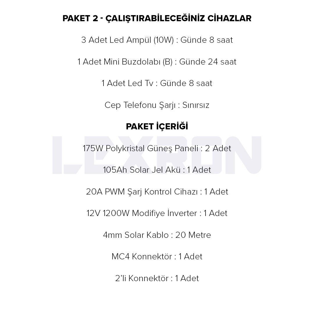 | - 175W Güneş Paneli | : | 2 adet |